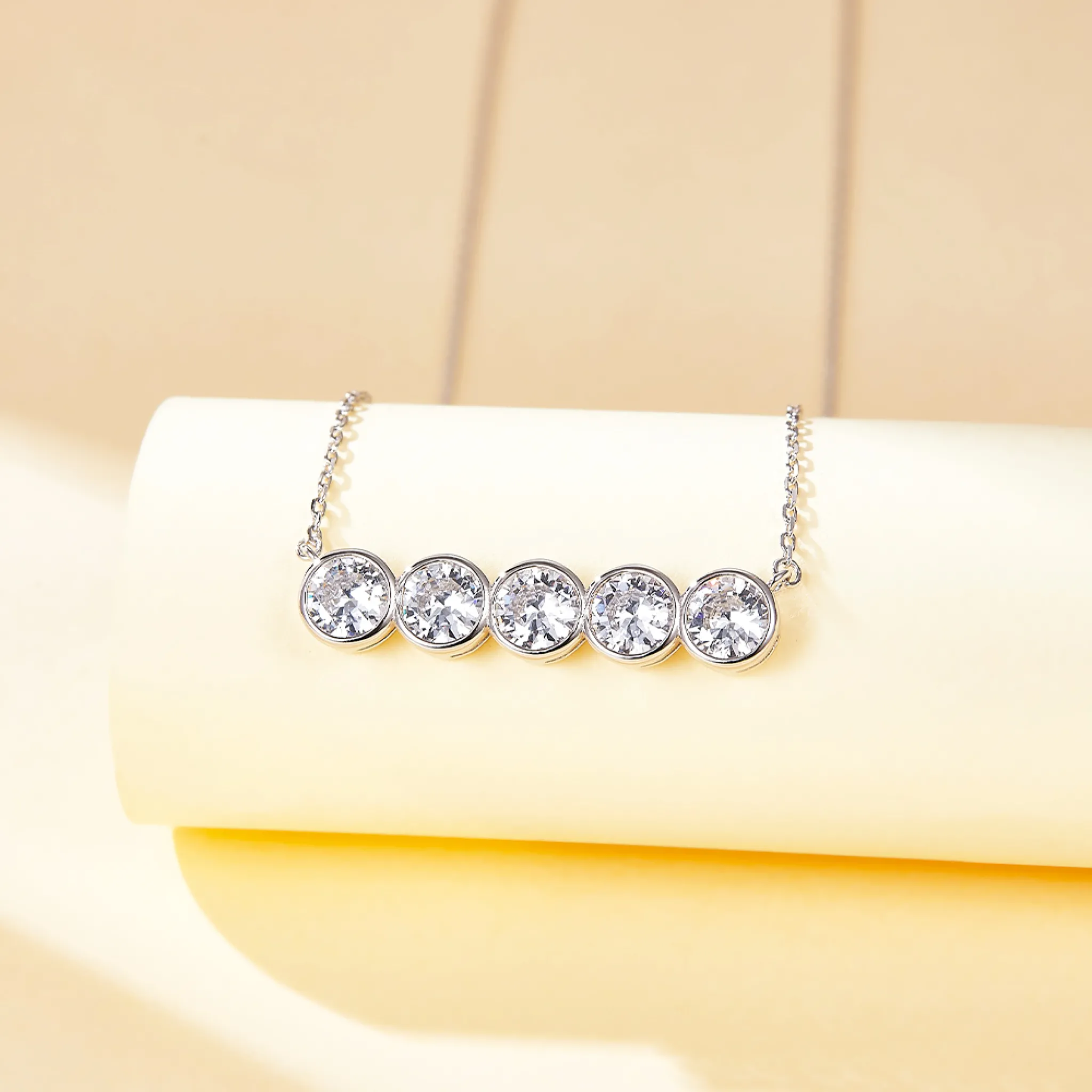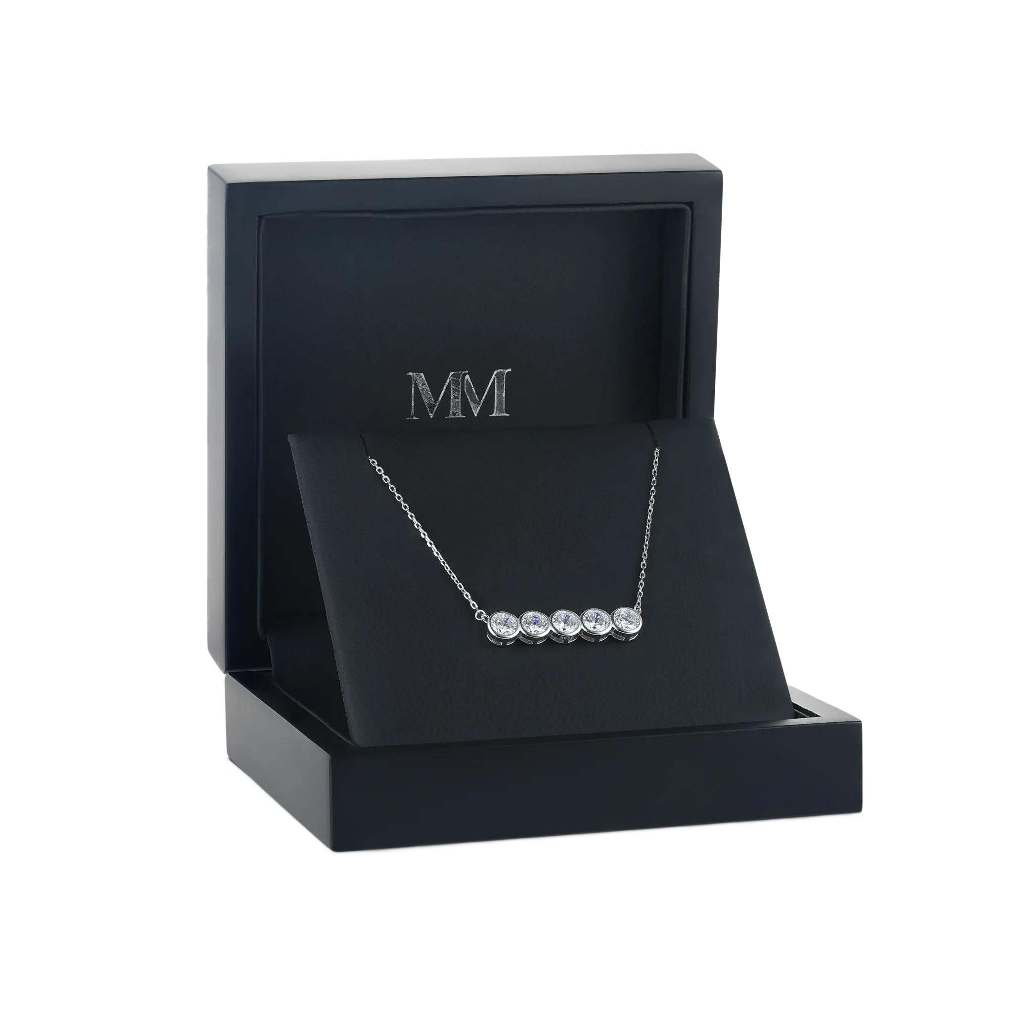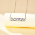 Die Quinta Halskette ist ein Paradebeispiel minimalistischer Eleganz, die fünf exquisit geschliffene Moissanit-Steine in einer sicheren Fassung präsentiert. Dieses Stück verfügt über eine verstellbare Kette von 40+5 cm, was eine perfekte Anpassung an jeden Halsausschnitt gewährleistet. Jeder Stein ist meisterhaft ausgerichtet und kreiert eine elegante Kaskade, die den Blick auf sich zieht. Entworfen, um die Tri-Bezel Ohrringe zu ergänzen, bildet diese Halskette Teil eines anspruchsvollen Ensembles. Die Präzision der Steinplatzierung spiegelt sich in der Feinheit der Kette wider und macht die Quinta zu einem Inbegriff verfeinerter Handwerkskunst und Stils.